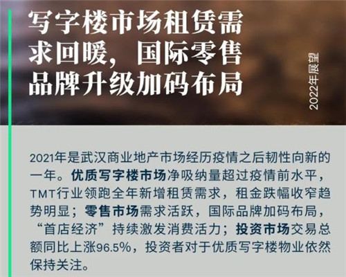 CBRE武漢分公司董事總經(jīng)理王祎表示,2022年,武漢優(yōu)質(zhì)寫字樓市場(chǎng)預(yù)計(jì)將迎來逾90萬平方米新增供應(yīng),其中不乏企業(yè)天地A1、綠地中心、首地財(cái)富中心等地標(biāo)型項(xiàng)目,新一輪供應(yīng)高峰隨之而來。高供應(yīng)量將在短期使空置率承壓,但數(shù)字經(jīng)濟(jì)引導(dǎo)科技新媒體行業(yè)釋放租賃需求,金融、專業(yè)服務(wù)、消費(fèi)服務(wù)等傳統(tǒng)行業(yè)韌性發(fā)展,預(yù)計(jì)租賃需求將穩(wěn)步回升。零售市場(chǎng)將迎來武漢大悅城、武漢萬象城、武商夢(mèng)時(shí)代等優(yōu)質(zhì)項(xiàng)目開業(yè),多個(gè)新興商圈將迎來首個(gè)具有區(qū)域影響力的項(xiàng)目入市,零售氛圍將進(jìn)一步提升。