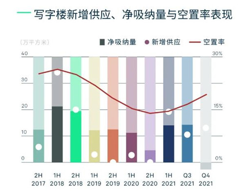 租賃市場穩(wěn)步發(fā)展,客戶方市場特征嶄露頭角。房地產(chǎn)“三道紅線”政策下,鄭州房地產(chǎn)租賃市場出現(xiàn)大面積退租及減租表現(xiàn),“雙減”政策下,在線教培行業(yè)業(yè)務(wù)收縮,波及第四季度全市寫字樓市場凈吸納量呈現(xiàn)負(fù)增長趨勢。全市寫字樓凈吸納量錄得負(fù)2.6萬平方米。市場活躍度降低,去化率減弱,凈吸納量出現(xiàn)負(fù)增長,CBRE預(yù)判2022年市場將逐步進(jìn)入客戶方市場。