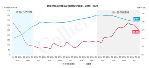 北京甲級寫字樓歷史租金和空置率,2010-2021