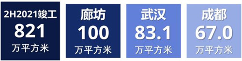 2021年下半年竣工面積最大的城市為廊坊,達(dá)100萬平方米。有5個(gè)城市的半年新增供應(yīng)超過50萬平方米:廊坊、武漢、成都、西安和嘉興。