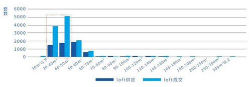 公寓兩種產(chǎn)品形式,SOHO/LOFT供銷均以30-50㎡為主;谛∶娣e低總價的優(yōu)勢,吸附全域投資屬性客戶。