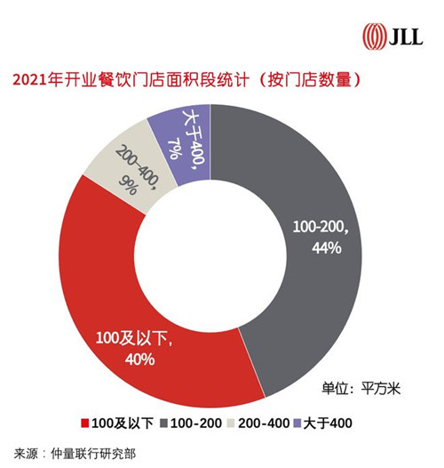 · 在小面積的餐飲門店中,面積在100平方米以下餐飲門店占比達40%,需求主要來源于咖啡及茶飲品類的擴張;
