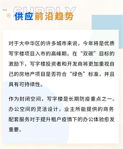 近日,戴德梁行發(fā)布《大中華區(qū)寫(xiě)字樓供應(yīng)/需求前沿趨勢(shì)》報(bào)告指出,今年大中華區(qū)許多城市將迎來(lái)高品質(zhì)寫(xiě)字樓項(xiàng)目入市的高峰期,在雙碳目標(biāo)的激勵(lì)下,寫(xiě)字樓投資者和開(kāi)發(fā)商將更加重視自己的房地產(chǎn)項(xiàng)目是否符合綠色標(biāo)準(zhǔn),并且具有可持續(xù)性。