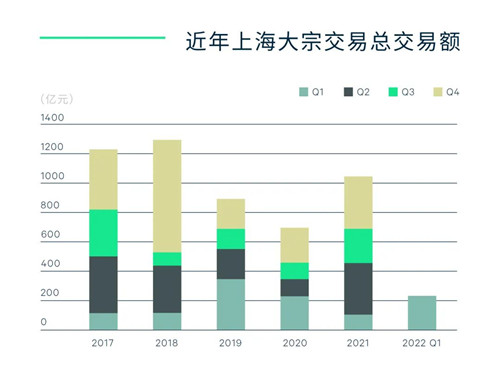 2022年第一季度,上海物業(yè)投資市場(chǎng)共錄得12筆大宗交易,交易金額共計(jì)人民幣226.5億元,環(huán)比下降36.4%,同比上升91.8%。盡管本季度時(shí)值春節(jié)假期,疊加季末疫情突襲申城,季內(nèi)成交總額依舊高于近五年同期均值。投資型交易依舊占據(jù)主導(dǎo),自用型交易僅占25%,側(cè)面反映目前投資者意向逐漸走強(qiáng)。