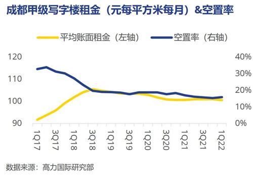 截至2022年第一季度末,成都市甲級(jí)寫字樓總存量約349.6萬(wàn)平方米,凈吸納量錄得2.9萬(wàn)平方米,傳統(tǒng)金融、商務(wù)服務(wù)及科技新媒體為三大需求主力,全市空置率環(huán)比上升0.5個(gè)百分點(diǎn)至15.9%,平均賬面租金環(huán)比上升0.1%,為100.6元每平方米每月。