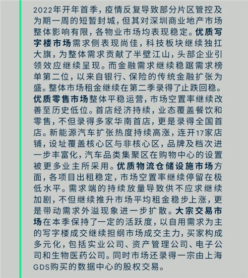 2022年第一季度,深圳高位供應(yīng)依然持續(xù),四個甲級寫字樓超30萬平方米的新增供應(yīng)于春節(jié)前交付使用,主要分布在前海和后海兩大片區(qū)。