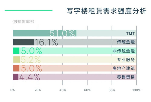 聚焦新租賃需求,科技板塊繼續(xù)獨扛大旗,為市場貢獻了超5成的新增需求,細分主要來自于科技互聯(lián)網(wǎng)板塊的軟硬件開發(fā)。本季錄得兩宗上萬平方米的國內(nèi)頭部科技企業(yè)的擴張需求,其中一宗達3萬平方米。金融類板塊需求占比在本季達21.1%,位列第二大需求,主要來自傳統(tǒng)金融企業(yè)的擴張,大面積成交聚焦銀行、保險兩大類子板塊。專業(yè)服務(wù)和房地產(chǎn)建筑并列市場第三大需求,占比均約5%。