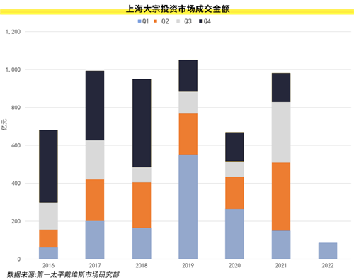 受疫情反復及動蕩的國際局勢影響,2022年第一季度上海投資市場整體活躍度較低,共完成八宗大宗成交,合計成交金額達人民幣84億元。除自用成交以外,大部分市場成交為“新經濟”板塊物業(yè)成交,第一季度市場有三宗工業(yè)物業(yè)及一宗園區(qū)物業(yè)成交,成交總額占總成交額的38%。大部分投資者對傳統(tǒng)型物業(yè)(寫字樓及零售)仍保持謹慎的態(tài)度,且對價格較敏感。四月初,太平洋房屋以低至人民幣13.95億元收購了綠地瀛通大廈一棟大廈,收購單價相當于9年前恒豐銀行收購該物業(yè)另一棟大廈價格的約六折。