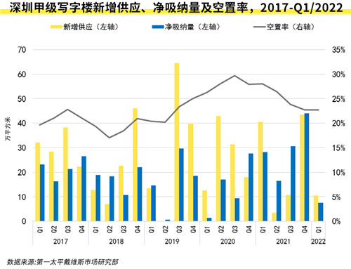 第一季度,租賃需求受本地疫情沖擊有所放緩,加之三月市場因疫情原因接近停滯,全市季度凈吸納量環(huán)比下降82.8%,錄得7.6萬平方米。受此影響,全市平均空置率在連續(xù)四個季度下降后再次環(huán)比微升0.1個百分點,至22.8%。