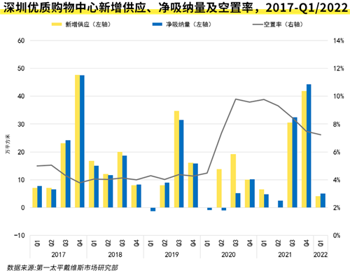 第一季度,受本地疫情沖擊,深圳消費市場增速放緩,零售物業(yè)市場租賃活動亦受沖擊,市場整體表現(xiàn)較平淡。盡管如此,標(biāo)桿項目的優(yōu)化調(diào)改仍有序進(jìn)行,位于羅湖、南山的部分項目陸續(xù)迎來多個國際品牌開業(yè)或擴張,項目入駐率上升,并推動全市平均空置率環(huán)比微降0.2個百分點,至7.2%。