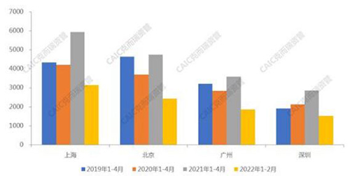2020 年 1-2 月以來,隨著疫情的穩(wěn)定,四個(gè)一線城市消費(fèi)零售顯著復(fù)蘇。22 年 1-2 月份,在四個(gè)一線城市爆發(fā)疫情之前,社會(huì)消費(fèi)品零售總額增速均保持較好態(tài)勢(shì)。22 年 3-4 月,四大一線城市逐步進(jìn)入封控期,消費(fèi)陷入停擺。參考往年 3-4 月平均水平,上海受影響最大,或?qū)⒊^ 2000 億元。