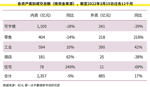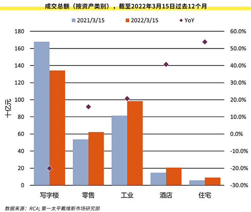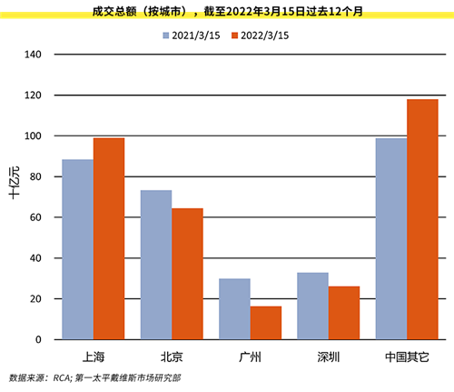 過去十二個(gè)月(截止2022年3月15日),一線城市成交額占總成交量63.6%。上海成交同比上升12%,而北京、廣州和深圳成交量同比分別下降12%,45%和20%,其中廣州的寫字樓和零售物業(yè)成交同比下降69%和54%。