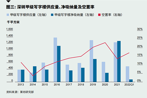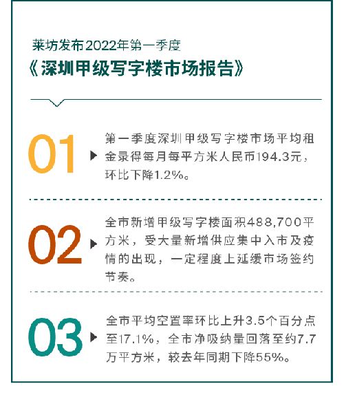 本季度前半段租賃需求旺盛,但3月受疫情影響,全市“暫停”一周,最終全市甲級(jí)寫字樓平均空置率環(huán)比上漲3.5個(gè)百分點(diǎn)至17.1%。全市凈吸納量為77,666平方米,較去年同期下降55%。后海區(qū)域大量新增供應(yīng)集中入市也是推高全市空置率的主要原因。