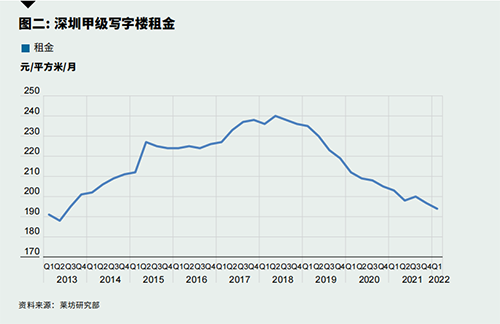 本季度,全市甲級(jí)寫字樓平均租金延續(xù)下行趨勢(shì),環(huán)比下降1.2%至每月每平方米人民幣194.3元,較去年同期下降1.9%。新增供應(yīng)的集中入市,令深圳甲級(jí)寫字樓市場(chǎng)平均租金自2018年后處于緩慢下行的通道。