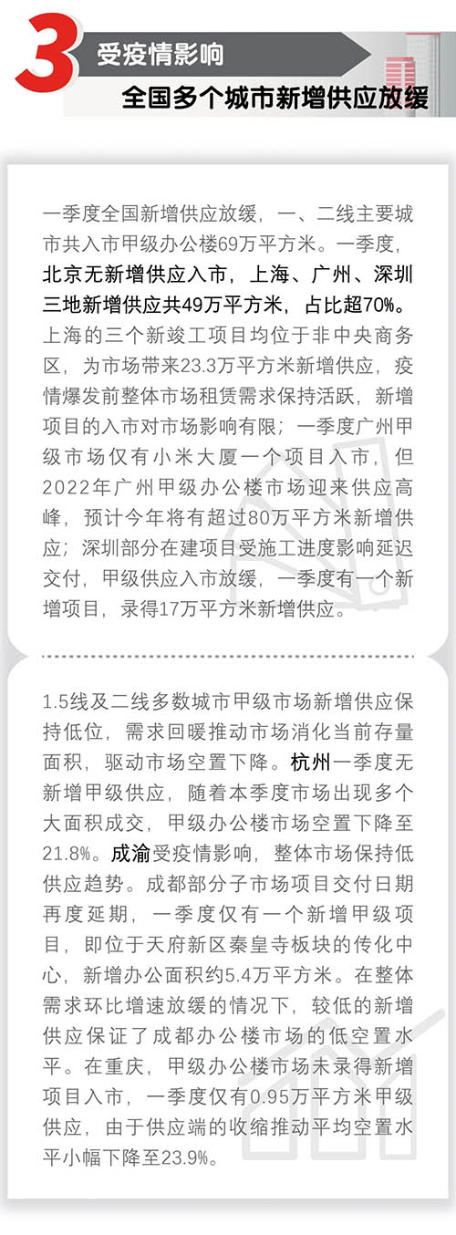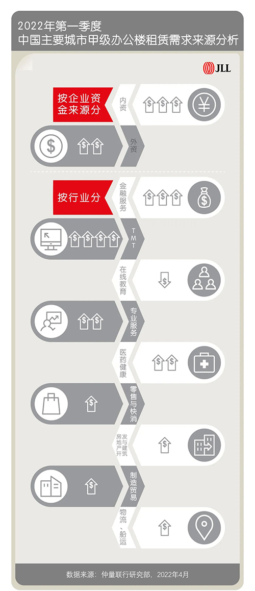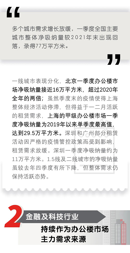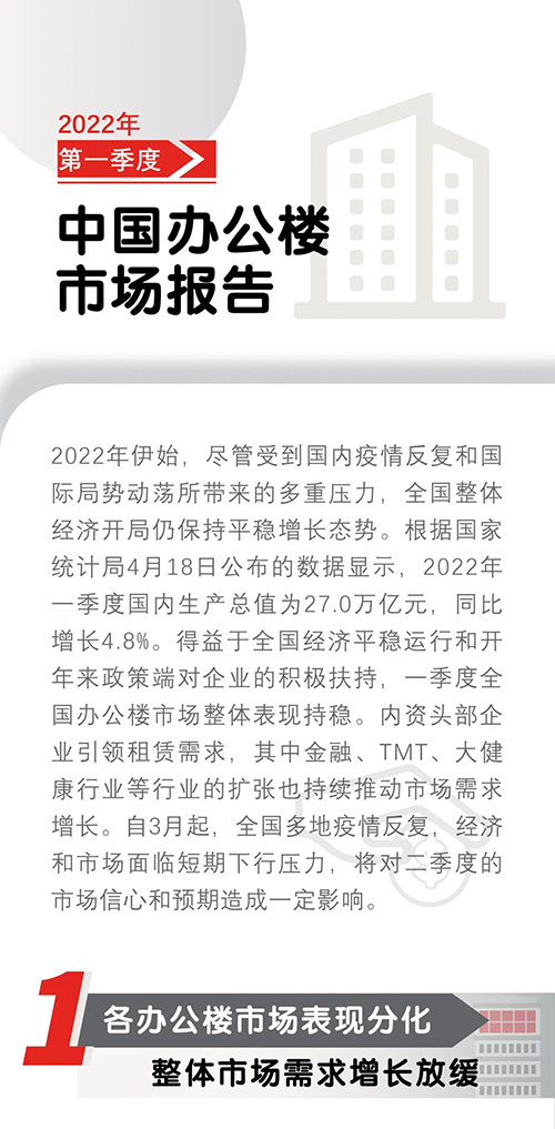 近日,仲量聯(lián)行發(fā)布2022年第一季度中國寫字樓市場報(bào)告,一季度,全國辦公樓市場整體表現(xiàn)持穩(wěn),內(nèi)資頭部企業(yè)引領(lǐng)租賃需求。自3約起,全國多地疫情反復(fù),將對二季度的市場信心和預(yù)期造成一定影響。
