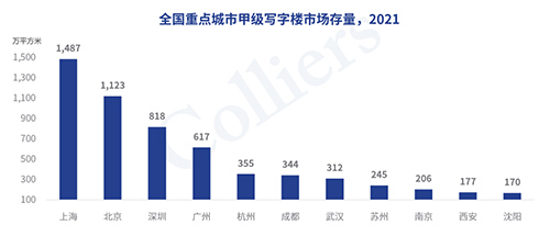 市場存量方面,上海、北京甲級寫字樓存量位居全國主要城市的前兩位。