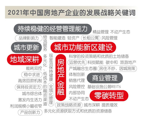 2021年,領(lǐng)軍房企在市場及政策環(huán)境中對其戰(zhàn)略視角進行了適應(yīng)性調(diào)整,未來行業(yè)發(fā)展主旋律在關(guān)注“風(fēng)控管理”、“資產(chǎn)證券化”的同時,也將圍繞“城市功能新區(qū)建設(shè)”、“科技賦能”、“地域深耕”和“不動產(chǎn)生態(tài)”等前瞻領(lǐng)域展開精進創(chuàng)新。
