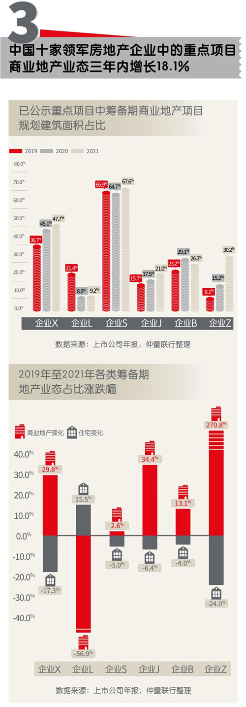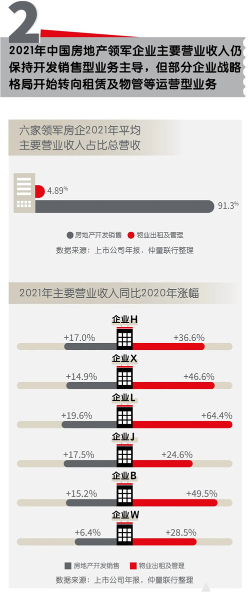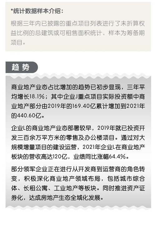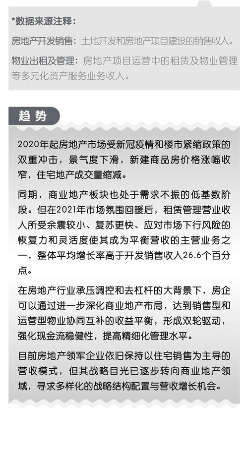 各大房企為適應(yīng)市場大環(huán)境的變遷,更加重視在全國范圍內(nèi)的商業(yè)地產(chǎn)的布局。幾家領(lǐng)軍企業(yè)的商業(yè)地產(chǎn)業(yè)態(tài)占比三年平均增長18.1%,業(yè)績平均增長率高于開發(fā)銷售收入的26.6個百分點。當(dāng)前,商業(yè)地產(chǎn)租賃及服務(wù)的高利潤運營業(yè)務(wù)模式已獲得更多市場關(guān)注度與認可,以優(yōu)質(zhì)辦公樓、長租公寓、工業(yè)地產(chǎn)為代表。
