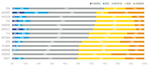 幾乎所有調(diào)查中提及的行業(yè),50%以上的受訪者認(rèn)為所在公司不會減少運(yùn)營成本的投入。其中,貿(mào)易、物流交通、金融保險行業(yè)目前受疫情負(fù)面影響較小;值得注意的是,超過12%的汽車、能源化工、TMT及醫(yī)療健康行業(yè)受訪者考慮疫情后增加運(yùn)營投入,為提振市場釋放積極信號。