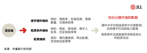 根據(jù)仲量聯(lián)行研究部的經(jīng)驗(yàn)與研究,未來(lái)租金走勢(shì)的影響因素分為客觀因素和由主觀行動(dòng)而產(chǎn)生影響的兩大類,其中主觀能動(dòng)因素約占六成。我們從宏觀端、市場(chǎng)端及項(xiàng)目端梳理出共130+個(gè)影響辦公樓市場(chǎng)租金的因素,若積極把握,將此類可主觀調(diào)整的因素影響發(fā)揮最大化,未來(lái)租金走勢(shì)將會(huì)趨好。