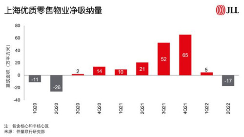受到疫情影響,2022年一季度上海優(yōu)質(zhì)零售物業(yè)凈吸納量?jī)H為5萬方,二季度的4、5月處于封控期,市場(chǎng)按下“暫停鍵”,而6月開始全面復(fù)商復(fù)市后,疫情影響開始顯現(xiàn)。據(jù)仲量聯(lián)行統(tǒng)計(jì),二季度上海優(yōu)質(zhì)零售物業(yè)凈吸納量為負(fù)17萬方。其中,受沖擊最大的為餐飲業(yè)態(tài)及線下體驗(yàn)業(yè)態(tài),包括影院、健身運(yùn)動(dòng)場(chǎng)館、線下娛樂游戲和兒童娛樂等等。