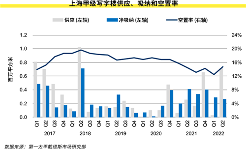 二季度迎來(lái)72萬(wàn)平方米新供應(yīng)入市,均為疫情前已基本具備交付條件的項(xiàng)目,且超半數(shù)集中于徐匯濱江板塊。4-5月份的疫情封控導(dǎo)致需求暫緩,在季內(nèi)錄得的26.9萬(wàn)平方米凈吸納量里,超九成為新項(xiàng)目此前的預(yù)租量。全市甲級(jí)寫字樓空置率環(huán)比上升2.3個(gè)百分點(diǎn)至14.8%,為過去一年以來(lái)高位;同期全市租金下跌1.0%,至7.3元每平方米每天。在租賃放緩的背景下,部分業(yè)主或?qū)㈥懤m(xù)給出租金讓步以維持出租率,因此年內(nèi)整體市場(chǎng)租金或繼續(xù)下探。