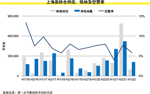2022年第二季度,上海非保稅高標(biāo)倉(cāng)市場(chǎng)無(wú)新增供應(yīng)入市,全市高標(biāo)倉(cāng)存量維持在645.8萬(wàn)平方米。市場(chǎng)在第二季度錄得約20.8萬(wàn)平方米吸納,市場(chǎng)去化情況良好,整體市場(chǎng)空置率水平較上季度下降3.3個(gè)百分點(diǎn)至5.8%,多個(gè)子市場(chǎng)維持滿租。