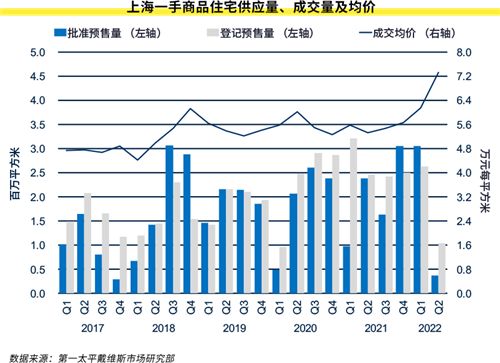 2022年第二季度,上海成交一手商品住宅約103.9萬(wàn)平方米,環(huán)比下跌60.5%,同比下降57.7%。一手商品住宅成交價(jià)格環(huán)比增長(zhǎng)19.2%,同比上漲37.9%,達(dá)到人民幣每平方米73,300元。受到疫情影響,住宅交易延遲,成交面積環(huán)比及同比均出現(xiàn)較大下滑,但是價(jià)格上漲一定程度上仍體現(xiàn)出需求支撐。在市場(chǎng)預(yù)期改善、政策大力引進(jìn)人才且疊加后續(xù)土地供應(yīng)的利好因素下,住宅交易信心有望得到進(jìn)一步提振修復(fù)。