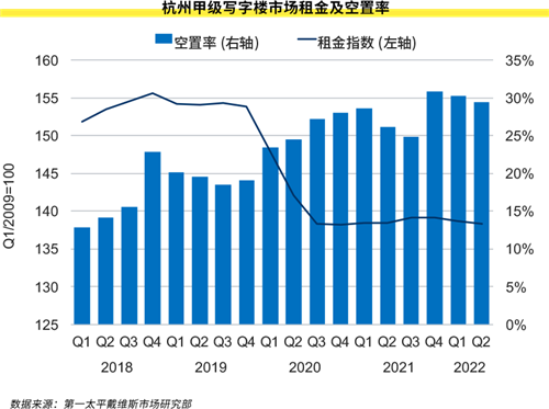 2022年第二季度杭州由于高科技行業(yè)的縮減以及直播、短視頻等互聯(lián)網(wǎng)企業(yè)收到政策監(jiān)管,寫字樓市場受到波及,整體表現(xiàn)疲軟;零售市場受周邊城市疫情影響較大,不少老牌購物中心以價格換取更高入住率,在政府支持下,相信會盡快重新恢復活力。