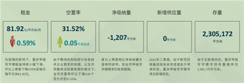 2022年第二季度,重慶未有新增甲級寫字樓供應(yīng)市場,甲級寫字樓市場存量維持在2,305,172平方米。