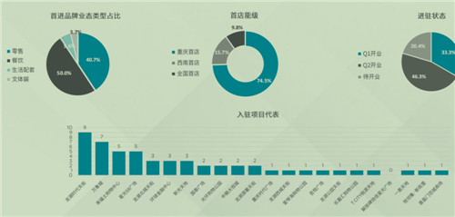 上半年重慶共引進(jìn)54家首店,其中74%是重慶首店,16%是西南首店,10%是全國首店;從業(yè)態(tài)來看,50%是餐飲品牌,41%是零售品牌,生活配套和文體娛則分別占5%和4%;而從開業(yè)時間來看,首進(jìn)品牌中,在一季度開業(yè)的有33%,二季度開業(yè)的占46%,剩下的21%預(yù)計在下半年開業(yè)。