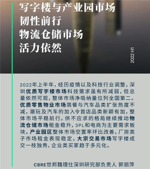 CBRE深圳分公司董事總經理吳偉冬表示,未來半年,受疫情和房地產行業(yè)宏觀調控雙重因素的影響,開發(fā)商對于現金流的追求將令大宗交易的供應端增加,可售寫字樓和零售物業(yè)將增多,從而推升大宗交易市場的整體活躍度。預計下半年市場交易額將步入上升通道,寫字樓與零售物業(yè)可售項目增多帶來的競爭性增加導致部分項目價格談判空間變大,從而促成成交。工業(yè)物業(yè)方面,憑借穩(wěn)定的租金增長、可通過REITs實現資本退出以及可通過城市更新實現較高增值的投資屬性,將繼續(xù)受到投資者的青睞,若出現優(yōu)質的投資標的,將吸引眾多投資者的重點關注。
