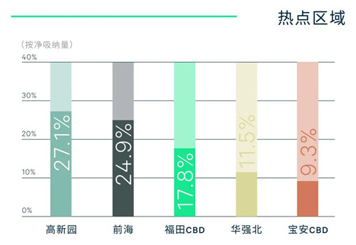 成交區(qū)域方面,受工業(yè)物業(yè)和整棟寫字樓交易的帶動,新興區(qū)域成交占比超6成,而核心區(qū)的寫字樓交易高度聚集于前海片區(qū)。