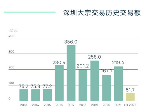 2022年上半年,深圳共錄得了9宗大宗交易,交易總額為人民幣51.7億元。受疫情影響,交易額同比和環(huán)比均有所回落,但依然保持一定活躍度。