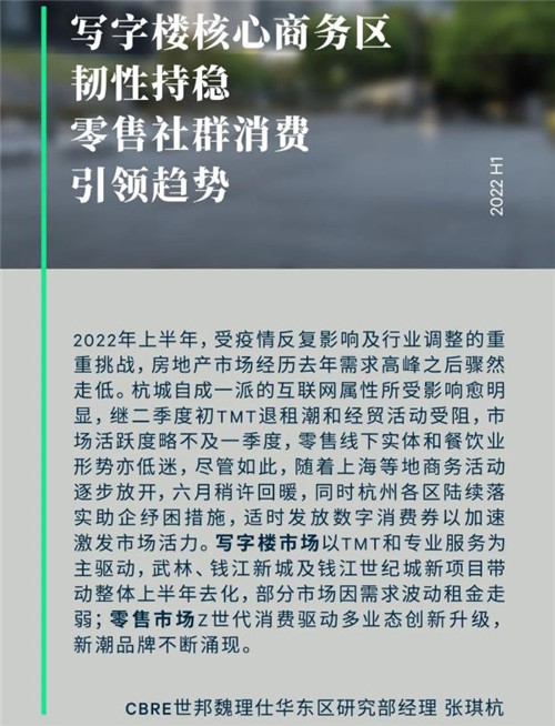 CBRE杭州顧問及交易服務部|辦公樓負責人王曉晨表示,上半年杭州寫字樓市場受到多地疫情反復和主力行業(yè)調整更迭加速影響,整體需求不及預期,小面積作為當前主力面積段需求短期無法快速填補空缺。租戶對價格敏感度升高,樓宇間價格競爭愈加白熱化。展望未來六個月,隨著亞運會的推遲,約有57萬左右新增供應有望如期投放市場,大部分集中于擁江發(fā)展帶等新興區(qū)域,能較好承接核心區(qū)騰退搬遷或蕭山區(qū)等老舊物業(yè)中現(xiàn)代服務和制造業(yè)等多元升級需求,同時隨著互聯(lián)網(wǎng)下半場向人工智能、XR數(shù)字內容等新技術轉變,新TMT細分類別將成為辦公空間擴張的新生力量。在抵御疫情不確定性的多重考量下,綠色智能樓宇、物業(yè)靈活性和辦公場所使用率業(yè)已逐步獲取更多新項目開放商的關注,杭州市場未來將給出更多積極回應。