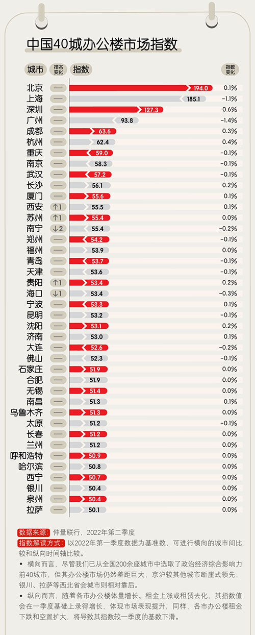 1. 排名前10的城市中,城市位次尚無變動(dòng),代表了頭部城市發(fā)展相對(duì)成熟的辦公樓市場(chǎng)結(jié)構(gòu)。其中,上海和廣州的指數(shù)變化較大,分別環(huán)比下降1.1%和1.4%。4月至5月疫情爆發(fā)拖累上海二季度的市場(chǎng)表現(xiàn),廣州則因?yàn)樾枨笙鄬?duì)疲軟加之空置面積走高,市場(chǎng)去化壓力處于高位。北京、深圳、成都、杭州、長(zhǎng)沙的指數(shù)變化錄得小幅正增長(zhǎng),表明其應(yīng)對(duì)市場(chǎng)波動(dòng)的內(nèi)生動(dòng)力相對(duì)充足;