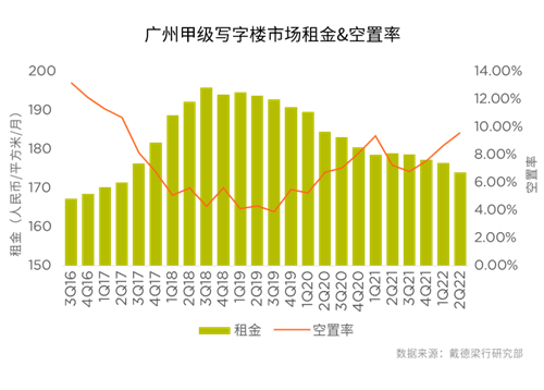 二季度,廣州甲級寫字樓市場錄得15.4萬平方米的新增供應。全市總存量攀升至594.9萬平方米。在新增供應的影響下,全市空置率上升至9.6%。上半年多地疫情多發(fā),防疫管控措施趨嚴令市場需求節(jié)奏有所放緩,凈吸納量環(huán)比下降15.3%至8.6萬平方米。全市平均租金環(huán)比下降1.4%至每月每平方米173.9元。