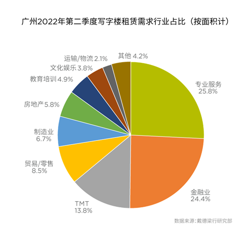 專業(yè)服務業(yè)和金融業(yè)需求活躍并成為寫字樓租賃成交的主力,成交面積分別占全市總成交面積的25.8%和24.4%。珠江新城作為兩大行業(yè)選址的優(yōu)先考慮,成交面積占比環(huán)比擴大14.5個百分點至45.3%。另一方面,TMT的租賃需求因受行業(yè)調(diào)整的影響而有所下降。