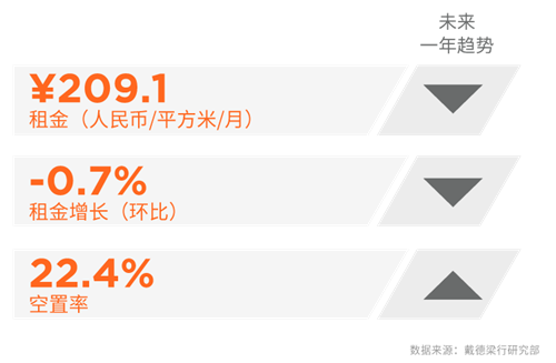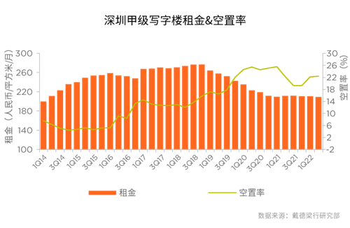 二季度,深圳迎來15萬平方米的新供應。疫情防控趨于穩(wěn)定,企業(yè)生產(chǎn)經(jīng)營活動逐步恢復,寫字樓市場活躍度亦有所復蘇。但受宏觀環(huán)境影響,企業(yè)普遍趨于謹慎和理性。多重壓力之下,甲級寫字樓市場平均租金環(huán)比僅下降 0.7%至每平方米209.1 元,空置率僅微升 0.2 個百分點至 22.4% 。