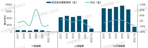 圖:2017年-2022年6月各線城市商辦用地成交規(guī)劃建筑面積及同比圖片