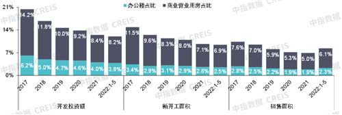 圖:2017-2022年1-5月全國商業(yè)營業(yè)用房及辦公樓投資、新開工面積、銷售面積占比