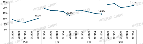 2022年3、4月以來,新冠肺炎疫情多點暴發(fā),宏觀經(jīng)濟面臨下行壓力,部分中小企業(yè)面臨經(jīng)營困境,疊加新增供應增加、疫情期間被抑制的租賃需求已逐步釋放完成等多重因素影響,部分城市寫字樓依舊面臨空置壓力。根據(jù)中指數(shù)據(jù),2022年一季度,一線城市甲級寫字樓空置率相對較低,其中廣州最低,為10.2%;二線代表城市中,杭州甲級寫字樓空置率為12.0%,空置壓力相對較小,廈門、西安、重慶、青島等城市甲級寫字樓空置率則在25%以上,空置壓力相對較大。