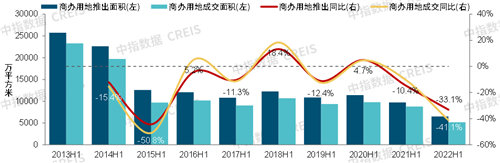 圖:2013年上半年-2022年上半年全國300城商辦用地推出及成交面積走勢圖片