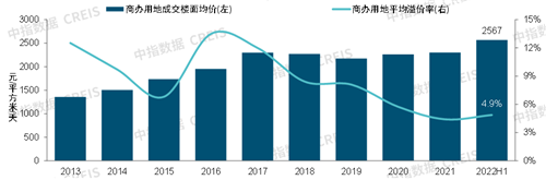 圖:2013年上半年-2022年上半年全國300城商辦用地成交樓面均價及平均溢價率走勢圖片