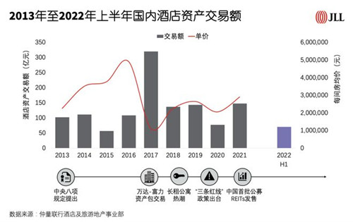 近期中國(guó)部分城市新冠疫情反復(fù),導(dǎo)致上半年酒店交易額同比下降43.8%,預(yù)計(jì)許多酒店交易活動(dòng)可能推遲到2022年第四季度或2023年第一季度。仲量聯(lián)行數(shù)據(jù)統(tǒng)計(jì)顯示,2022年上半年酒店成交額約為70億人民幣,預(yù)計(jì)2022年,中國(guó)酒店交易總額將達(dá)到約135億人民幣。