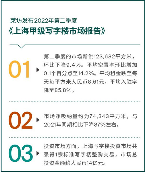 2022年第二季度,受疫情影響,投資市場(chǎng)表現(xiàn)并不活躍,上海投資市場(chǎng)共錄得1宗標(biāo)準(zhǔn)寫(xiě)字樓整購(gòu)交易。4月4日,上海太平洋置業(yè)以人民幣約14億元成功拍下第三次上架阿里拍賣的瀛通綠地大廈。瀛通綠地大廈位于黃浦區(qū)南部,緊鄰徐匯濱江,為一商辦綜合項(xiàng)目,房屋總計(jì)建筑面積40,392.62平方米。按照面積與成交價(jià)格來(lái)算,剔除30萬(wàn)一個(gè)的車位價(jià)格,上海瀛通綠地大廈的成交單價(jià)約為每平方米32,665元。