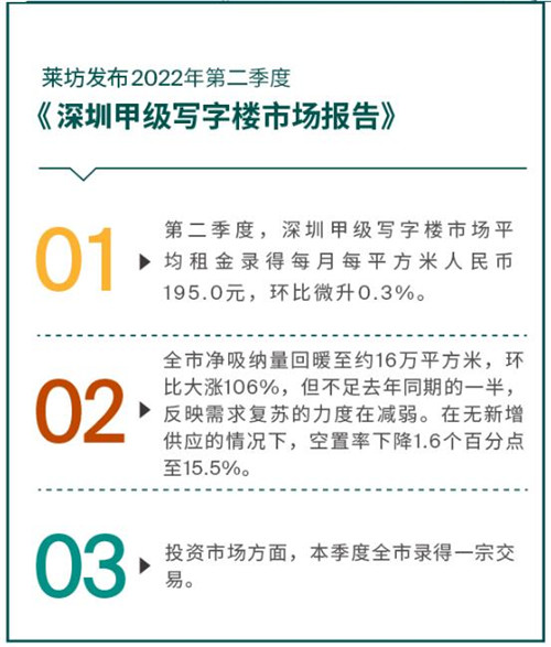 萊坊高級董事及中國區(qū)研究及咨詢部主管朱磊表示,本季度全市租金走勢是自2020年疫情爆發(fā)后第二次正增長,租金反彈主要原因是疫情所延誤的租賃需求得到集中釋放,以及上季度深圳各區(qū)因疫情陸續(xù)推出的減免租金,貸款利息優(yōu)惠等惠企紓困措施,部分非國有企業(yè)受政策影響,正考慮租金優(yōu)惠的事宜。