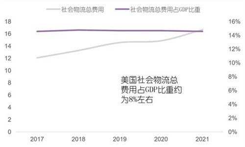 近年來,伴隨著市場規(guī)模的不斷擴張,我國交通運輸和倉儲的需求不斷上升, 2021年,社會物流總費用達到16.7萬億元,占GDP的比例為14.6%,與發(fā)達經(jīng)濟體相比,我國現(xiàn)階段物流總費用占GDP比重依然偏高,例如,美國社會物流總費用占GDP比重約為8%左右,可見我國物流地產(chǎn)降本增效空間較大,綠色物流前景廣闊,物流倉儲業(yè)是實現(xiàn)低碳經(jīng)濟的重要推動行業(yè)。