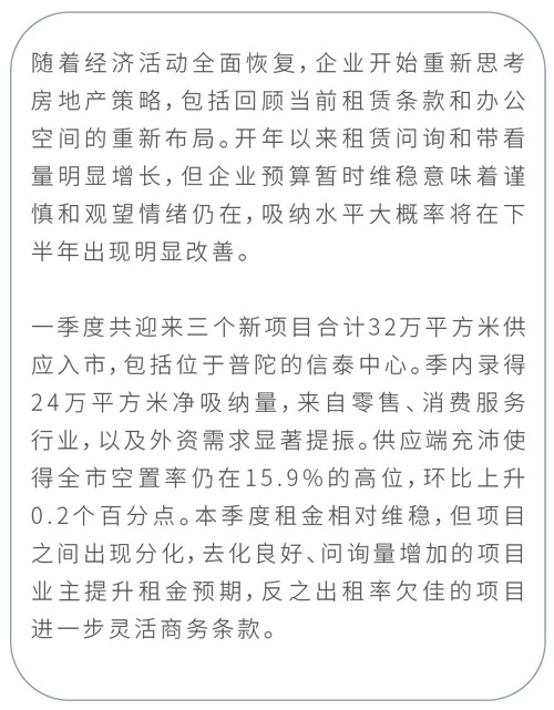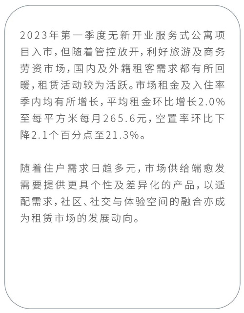 隨著清零政策取消,租賃問(wèn)詢明顯增加。企業(yè)希望通過(guò)評(píng)估實(shí)際情況以制定未來(lái)計(jì)劃,并采取擴(kuò)張、搬遷或削減成本的措施。情緒回升、銷(xiāo)售回暖及政府支持也鼓舞了零售商,但反映在吸納量及出租率改善上還需要時(shí)間,或在下半年才能有更為顯著表現(xiàn)。雖有新增供應(yīng)推高空置率,但物流需求仍保持穩(wěn)定。而受到季節(jié)性因素和就業(yè)群體返滬利好影響,住宅租賃市場(chǎng)較為活躍。