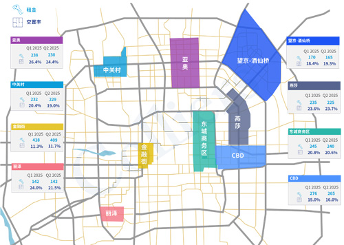 2025年第二季度,北京甲級寫字樓延續(xù)一季度“總量去化、區(qū)域分化”的態(tài)勢?罩寐蔬B續(xù)七個季度穩(wěn)定在20%左右的水平,市場正處于新增供需動態(tài)平衡階段。凈有效租金降幅進一步收窄,為近三季度最小租金降幅。
